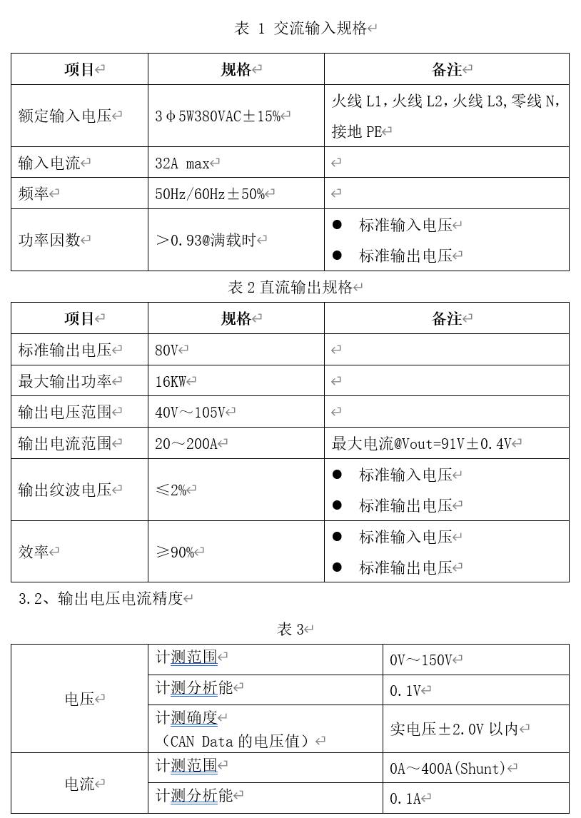 表1及表2表示 E-Pump充電機(jī)系統(tǒng)的交流輸入及直流輸出規(guī)格.